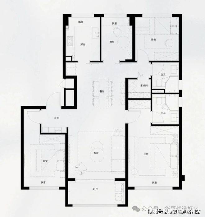 建面约138㎡4房2厅2卫,是经典的飞机户型。这类户型最大优点是动静分区清晰、横向展开,客餐厨与阳台可以形成LDKG一体化南北通,让家庭社交面向外自然延伸
