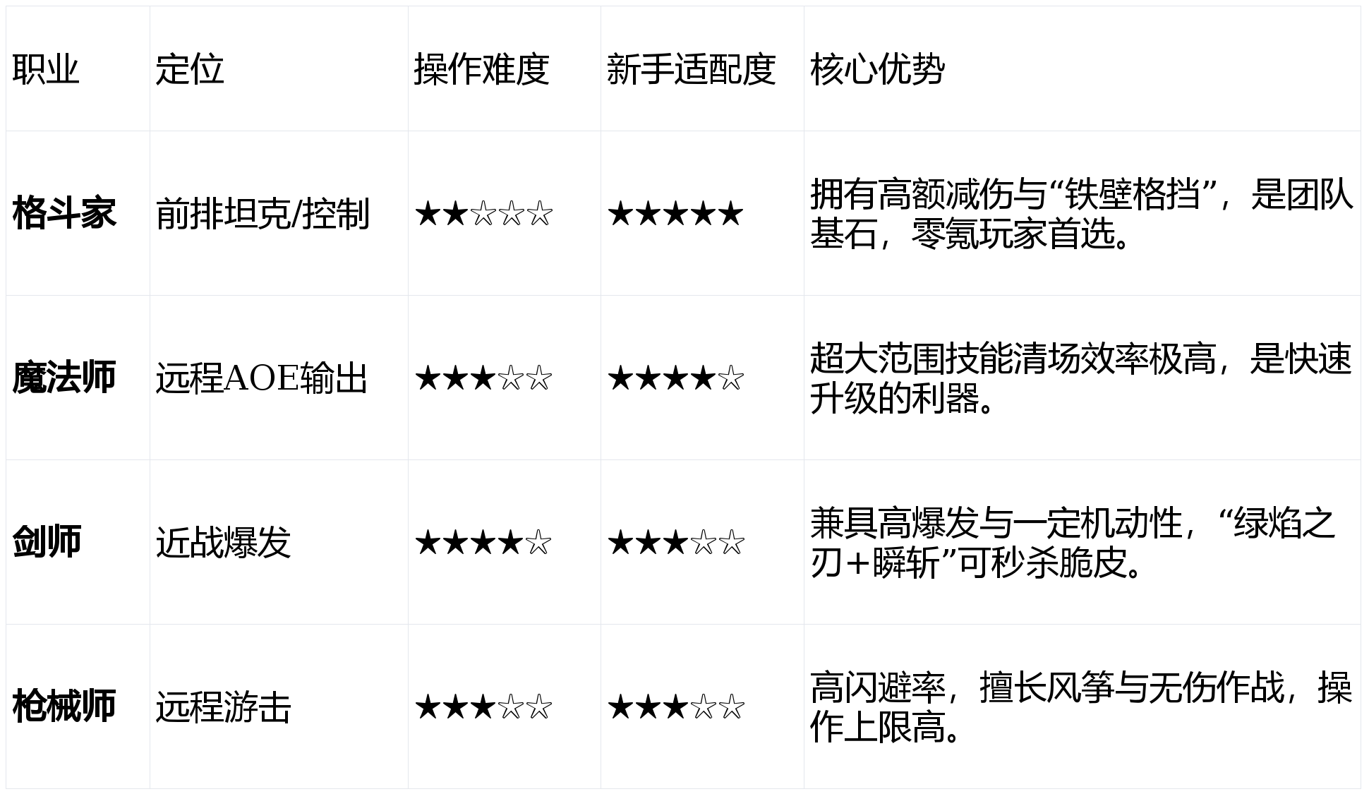 对于新老玩家而言,选择一个合适的起步职业至关重要。下表为四大职业的定位解析: