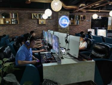 跟着这名工作人员顺着斜坡下行,转过弯便是网吧的收银台。看得出,整个网吧面积不小,偌大的空间内配置着近百台电脑。其中,靠近收银台的30余台电脑可供上网使用,其余暂未开放。可以开机使用的这30余台电脑,多是以5台位一排摆放的。由于上网人员较多,当天的上座率接近七成。无论彼此是否相识,多数网友都是紧挨着坐在一起。
